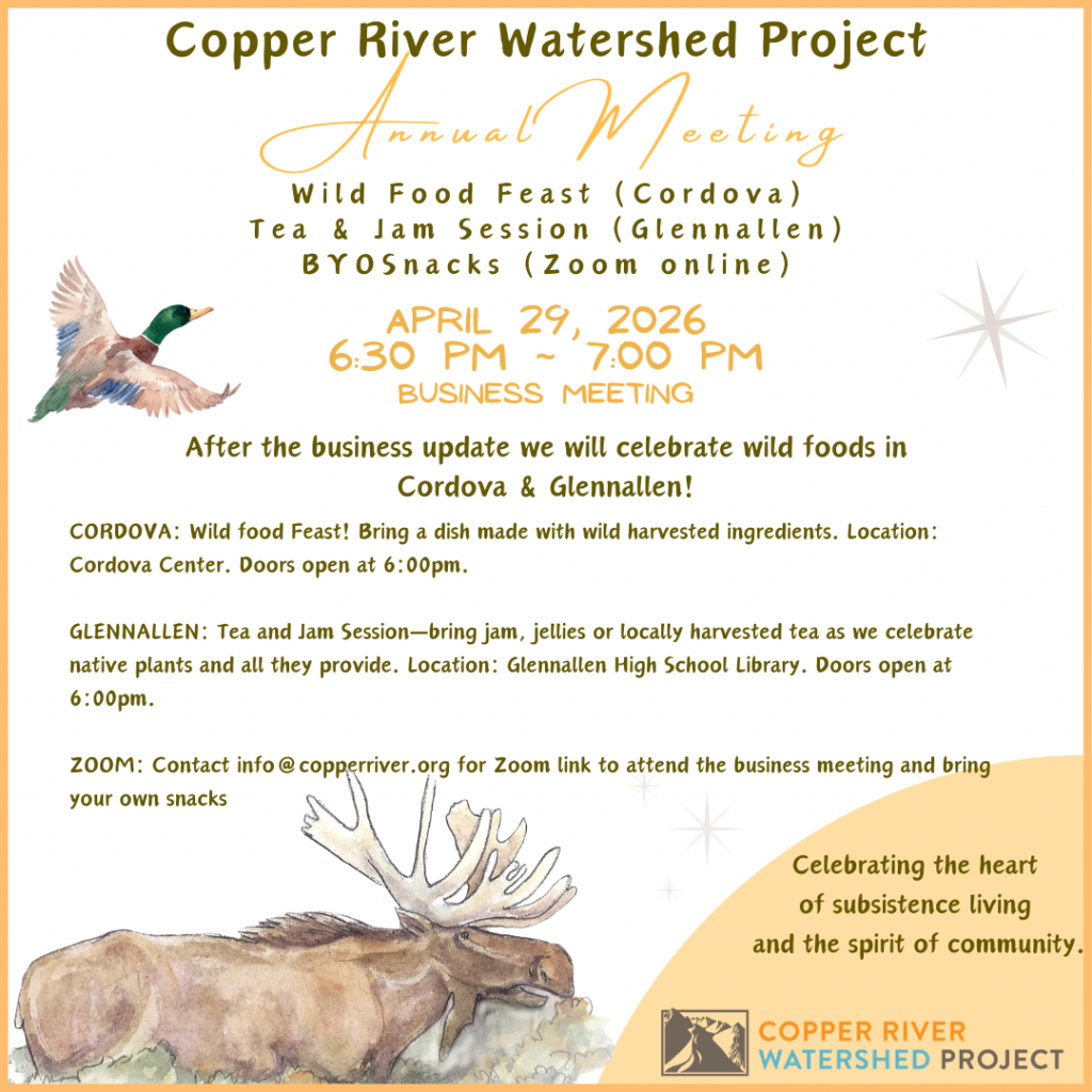 🎉You`re Invited to join us for the Copper River Watershed Project Annual Meeting on Wednesday, April 29, 2026 6:30pm-7:00pm AKT! You can attend in-person in Cordova or Glennallen, or on Zoom.