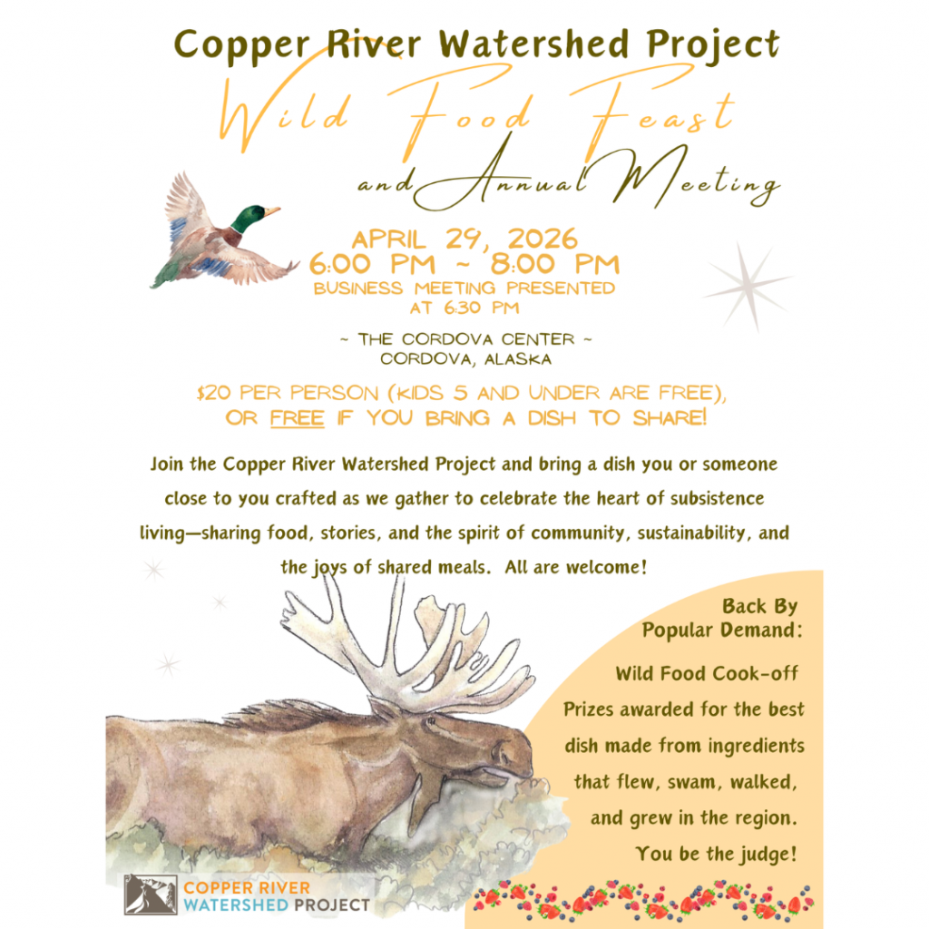 CORDOVA – Come for the Wild Food Feast, stay for the CRWP Annual Meeting! Bring a dish you or someone close to you crafted as we gather to celebrate the heart of subsistence living—sharing food, stories, and the spirit of community, sustainability, and the joys of shared meals. All are welcome!